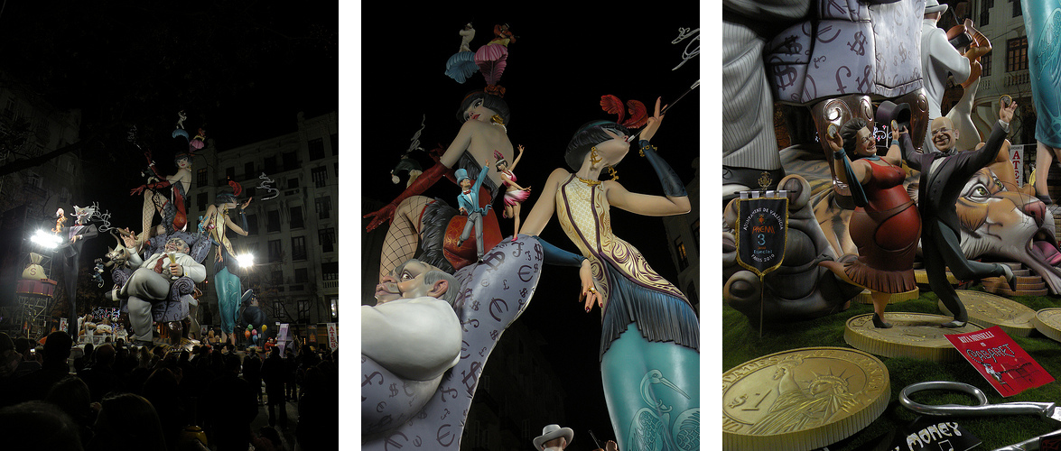 Just after nightfall we ventured back into the city centre, where we found my favourite falla, which won 3rd prize. Titled “Crisis, what crisis?”, it was a caricature of the world’s spending habits in the months leading up to the global financial meltdown. Along with a fat cat banker seated in his plush armchair, two decadent women smoked cigarettes in long holders – à la Audrey Hepburn – while the smoke rose in distinctive dollar, euro and pound signs. Then there was a whole host of other figures doing different things around them, including Valencia’s own mayor “La Rita”, who was dancing on giant coins with another Spanish official. And around the back were satires of key heads of state in various stages of economic trouble.