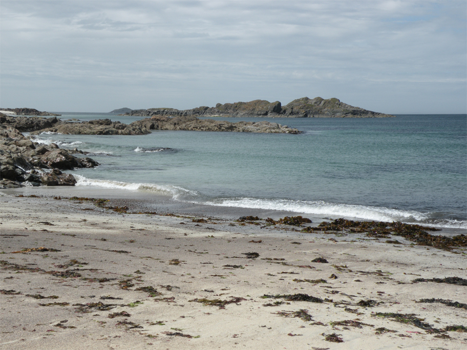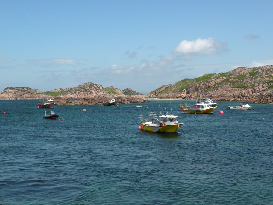By the time we reached the ferry crossing at Fionnphort, the low rain clouds were nowhere to be seen. We stepped off the coach and were immediately awestruck. Spread out in front of us was a white sand beach and what looked like a tropical blue sea, studded with small boats and granite outcrops.