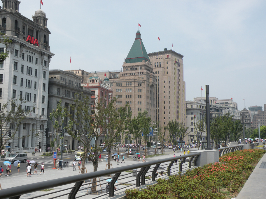 In the midday heat the promenade seems relatively empty, and I linger for a while, marvelling at the improvements made in the two years since I had last been in Shanghai. Apart from upgrading the paving slabs and benches, the authorities had added sweeping steps, trees and vertical green walls.