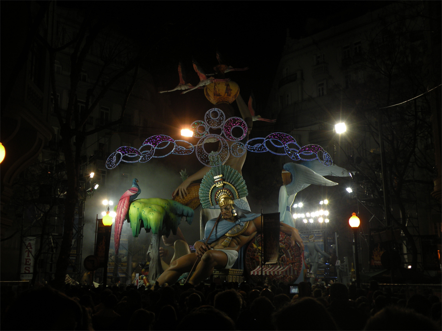 It is half past 11 and we are wandering through the madness of the city streets. Around us fireworks shoot from the narrow intersections where the childrens’ fallas once stood, their remains smouldering in a heap of black ashes. We pick 2nd prize in the special category, a towering monument featuring an Aztec king and his resplendent headdress. With fizzy alcoholic drinks in hand we take our spots a good distance from the promising inferno.