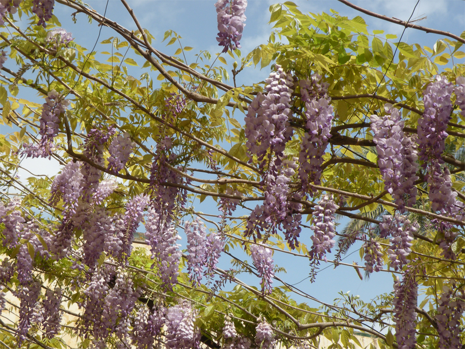 Eventually we were drawn outside by the telltale clusters of oranges, their perfect spheres glowing brightly in the midday sun. I looked up at the purple shapes dangling above our heads. It was a sprawling vine of wisteria, stretching languidly across the entire length of the terrace.