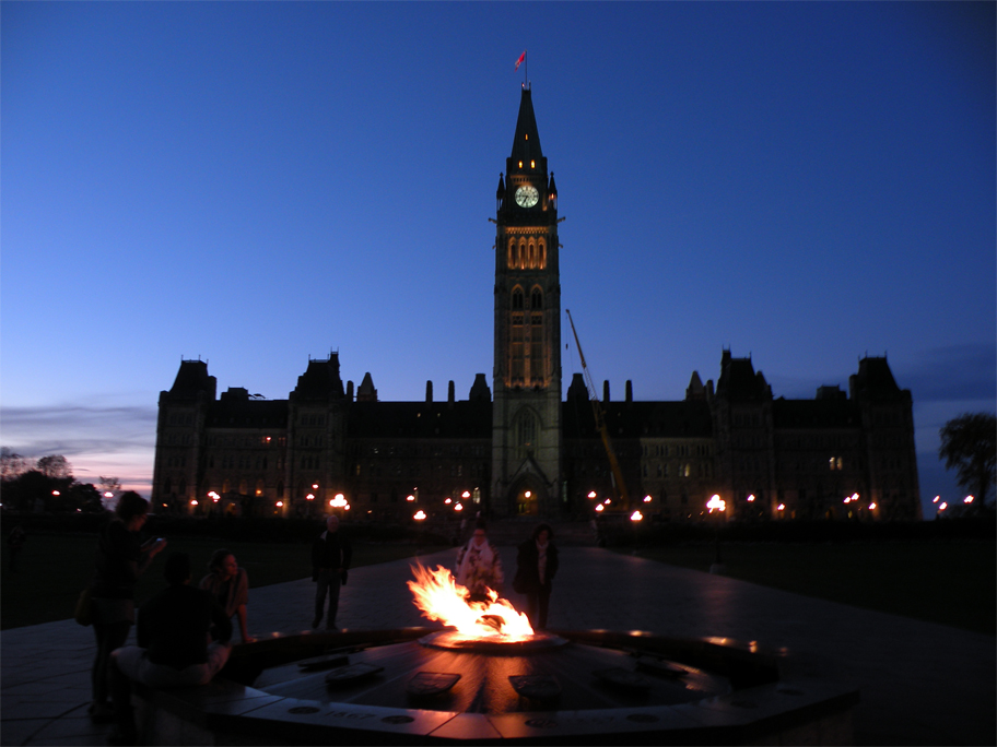 Darkness is falling when I arrive at Parliament Hill. A handful of onlookers huddle around the Centennial Flame, drawn like children to a campfire. At seven o’clock I sit on a low wall by the steps, listening to the Cambridge Quarters and then the solemn peal of the Peace Tower bell.