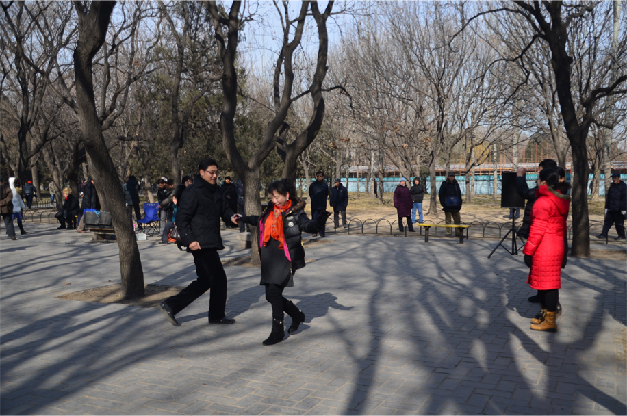 Under the empty branches we discover an enthusiastic singer crooning into her microphone, belting out 80s tunes as a group of dancers swirl effortlessly across the paving stones. Still the air is punctuated by the tac-tac-tac of yet more jianzi players, and I watch them, enthralled, as they skillfully tap the feathered shuttlecocks off their hips, knees and feet. It’s a sight worth getting up for on a wintry Saturday morning.