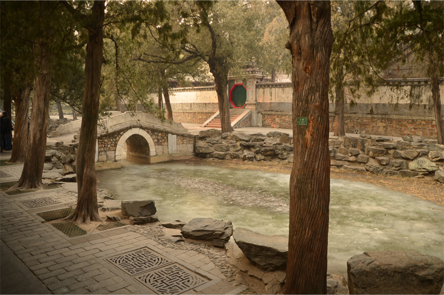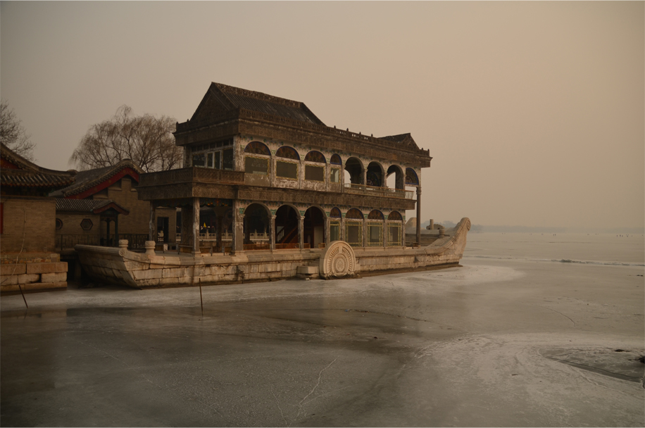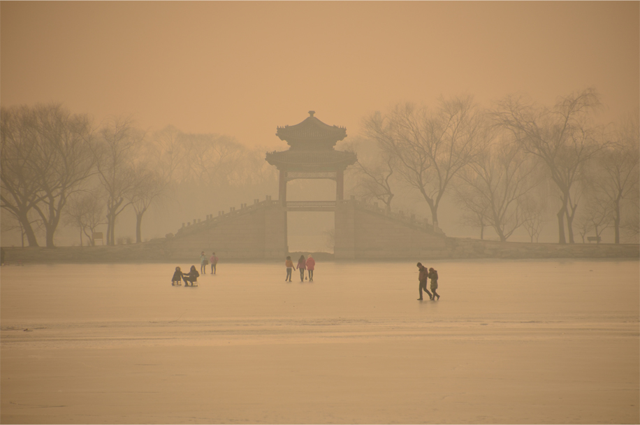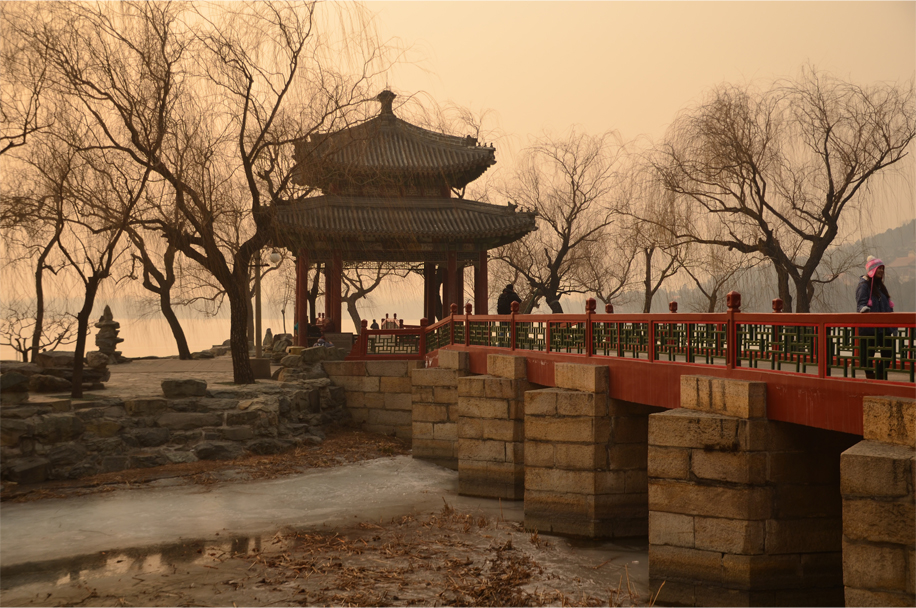 Even in the smog, the lake is undeniably beautiful. Nearby the vendors offer bags of freshly grilled corn on the cob and skewers of candied Chinese hawthorns. I am observing the frozen waters from the Pavilion of Heralding Spring, where the weeping willows are the first to bud and the ice already broken.