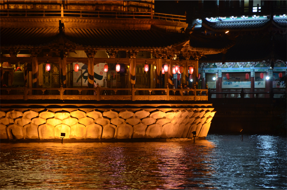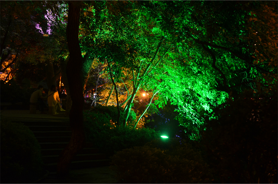 At nearby Osmanthus Lake, we take in the Sun and Moon Pagoda, their dazzling appearance reflecting in the waters plowed by the occasional pleasure boat. Meanwhile a two-man band is crooning romantic melodies across the rippling lake, backed by a shoreline lit up in a kaleidoscope of green, yellow and purple. We make a full circuit before strolling down a pedestrian avenue in search of a quiet drink. Crossing the road, even the green man seems to be doing the moonwalk.