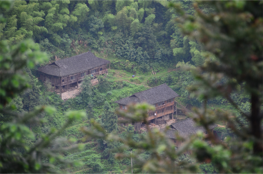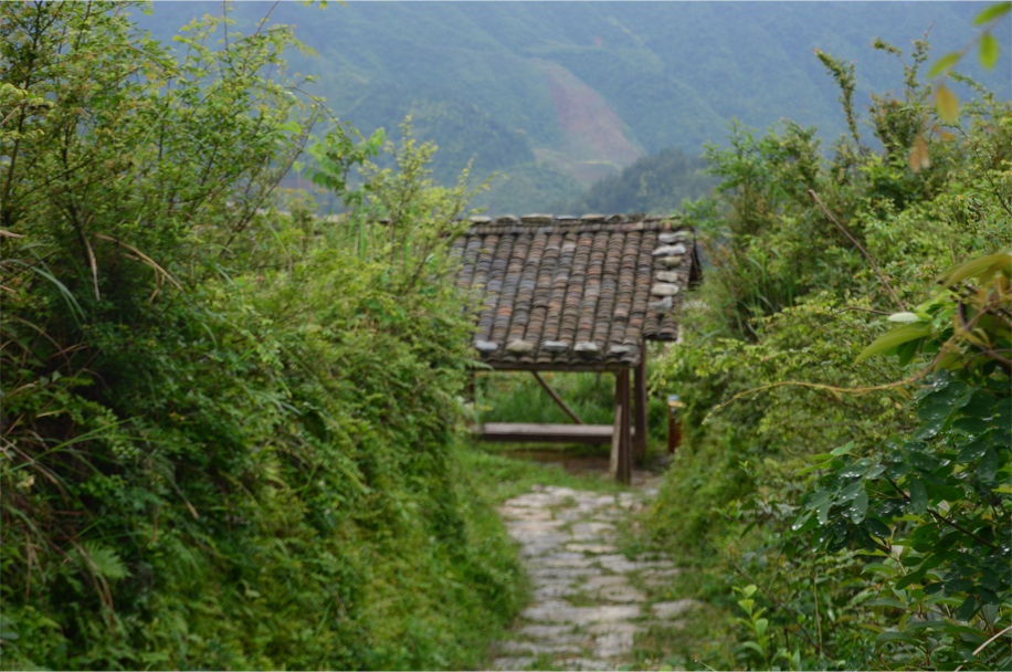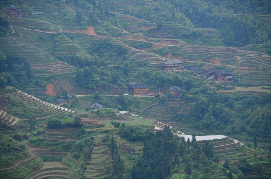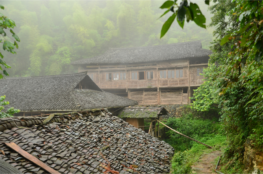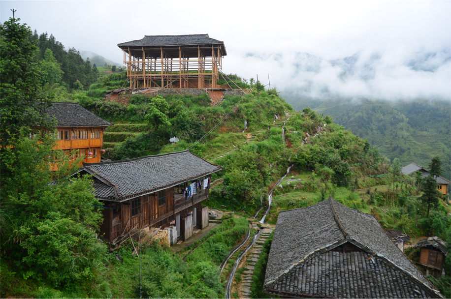 It’s a 40-minute hike from the entrance gate, up a twisting gravel road and past a series of weathered diaojiaolou. Previously we had spotted these “hanging houses” on the way in from Guilin, clinging to the terraced slopes, curling wisps of smoke rising amid the tumbling cascades of grey tile.