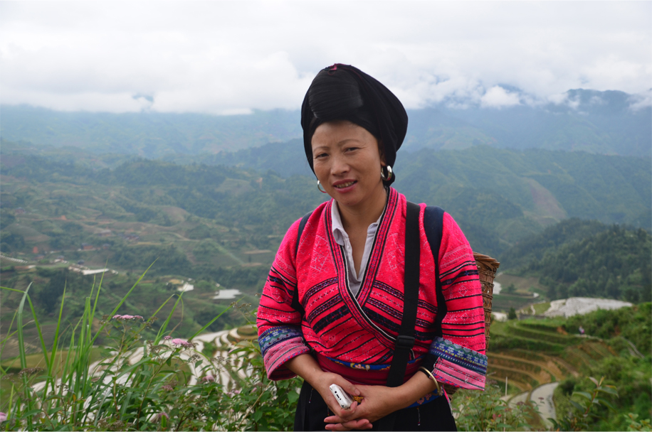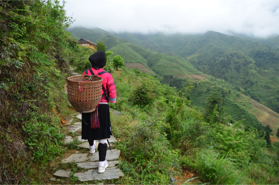 A second Yao porter, perhaps in her early forties, motions us to carry on, up the hill and into a thick patch of fog. We are accompanied by the sound of water rushing from the mountaintop, rising from the hand-dug channels lining the pathway. Beneath our shoes the thin slabs of shale glisten like obsidian in the drizzling rain.