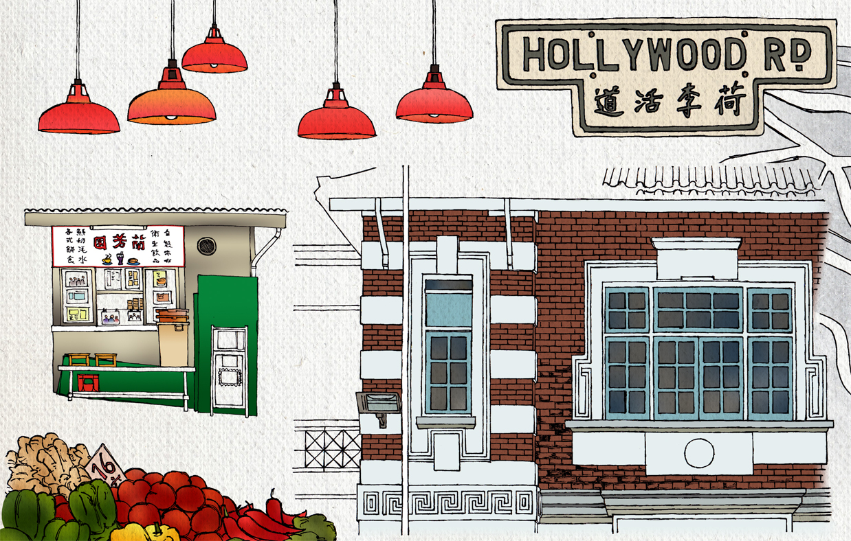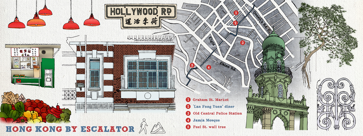 Countless journeys along this unusual corridor inspired my second contribution to They Draw & Travel – one that highlights a few of the treasures that can be found just steps away from the escalator. Had I more room I would have included the well-worn steps of Pottinger Street, designed to allow policemen to travel on horseback, and the curious case of Rednaxela Terrace, whose name stuck after its sign was mistakenly painted right to left, in the old Chinese manner.