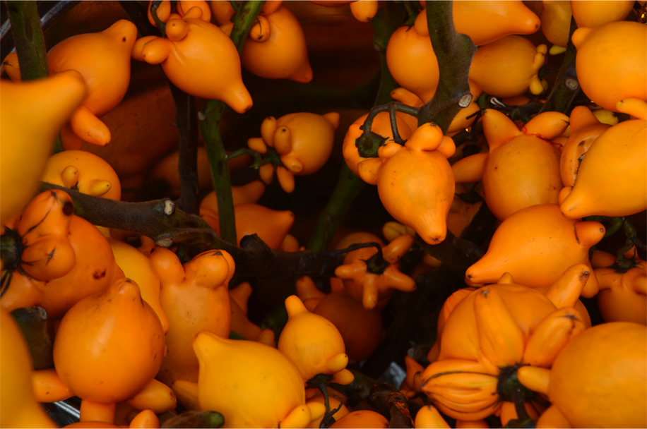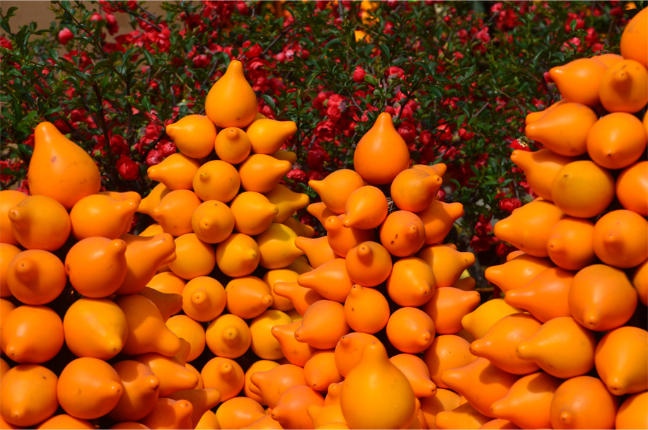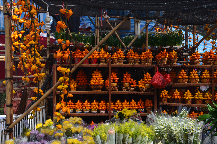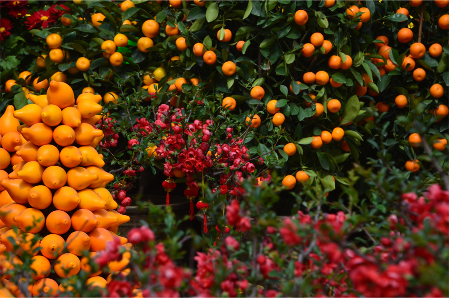Those seeking success in their love lives might purchase bundles of peach blossoms, while orchids – representing fertility – are given as gifts to newlyweds and expectant mothers. Rows of tangerine bushes bear witness to the Cantonese love of puns: the word for “tangerine” is also a homonym for “lucky”. Other stalls are decorated with a curious South American fruit, known as “five generations together in one house”. Carefully stacked into New Year trees, these voluptuous, inedible fruit are known in English by a rather more straightforward name.