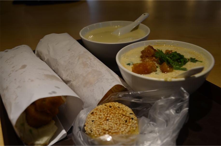 Here I seek the comforting crunch of youtiao, a fried bread stick that is virtually a meal on its own. But this time it comes wrapped in a thick slab of houbing – a combination of freshly baked dough and scallions. We sip languidly at a bowl of soy milk, smooth as velvet and just sweet enough to taste the extra grains of sugar. The real surprise is its savoury version, served with fat chunks of youtiao, baby shrimp, coriander, drops of vinegar and chilli oil.