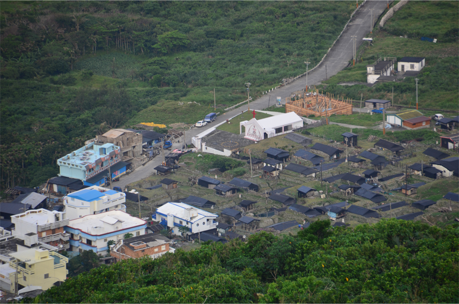 Near the end of our four-hour scooter ride, the nuclear waste dump came into view, occupying a lip of land at the foot of a verdant, crumpled ridge. Several long rows of innocuous-looking sheds, half-buried as though a perversion of the traditional houses, were built into grassy terraces dropping down towards the ocean. I grimaced, noticing how a retaining wall was all that separated it from Tao fishing grounds and the coral reefs that fringed the island.