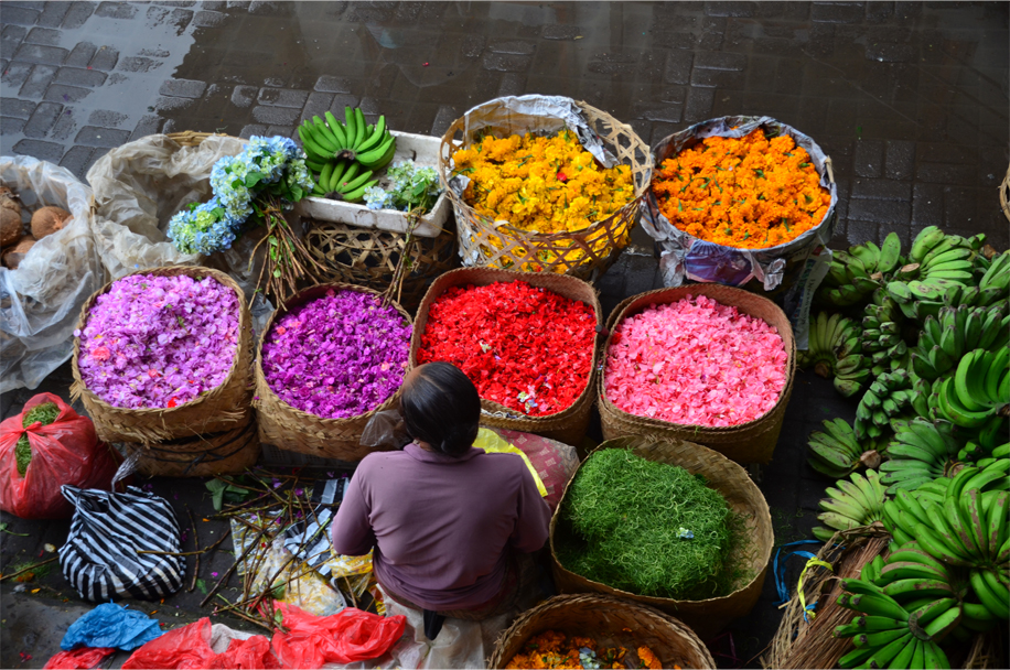 On Ubud’s pavements we tiptoed around the ubiquitous canang sari – a miniature basket of woven palm leaves, filled with petals in four colours and fern tips, then topped by several incense sticks, sprinkled with holy water and laid twice a day outside homes, shop fronts, restaurants and guesthouses. We saw them being carefully prepared early in the morning at Ubud Market, before its daily transformation into a bazaar selling art and handicrafts.
