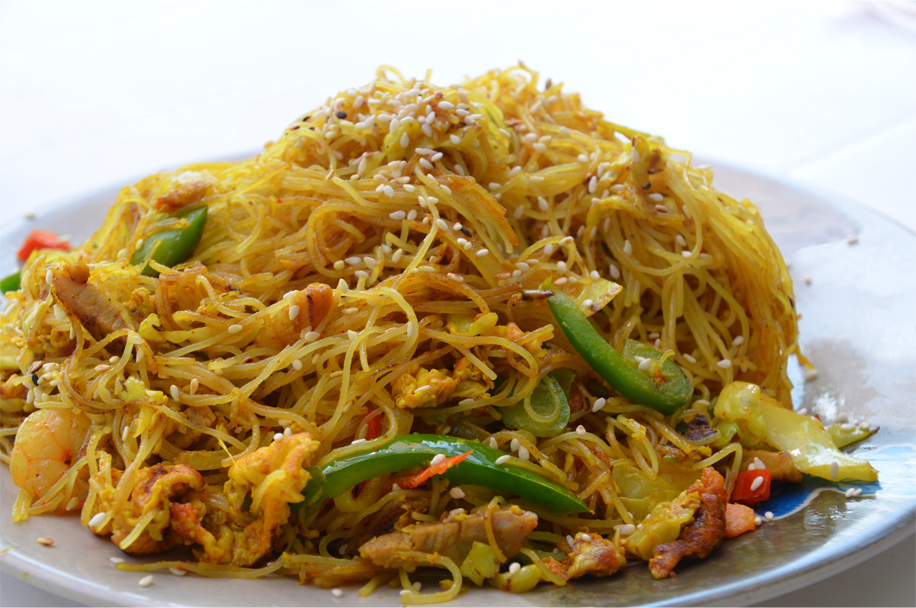 We scoop up mouthful after mouthful until only drops of golden oil remain, glistening like tiny constellations on an ocean blue sky. For a moment, I imagine the old deliveryman somewhere up the hillside, grinning away at the balmy weather, the magnificent scenery and the thought of Mr. Lai’s Singapore noodles. ◊