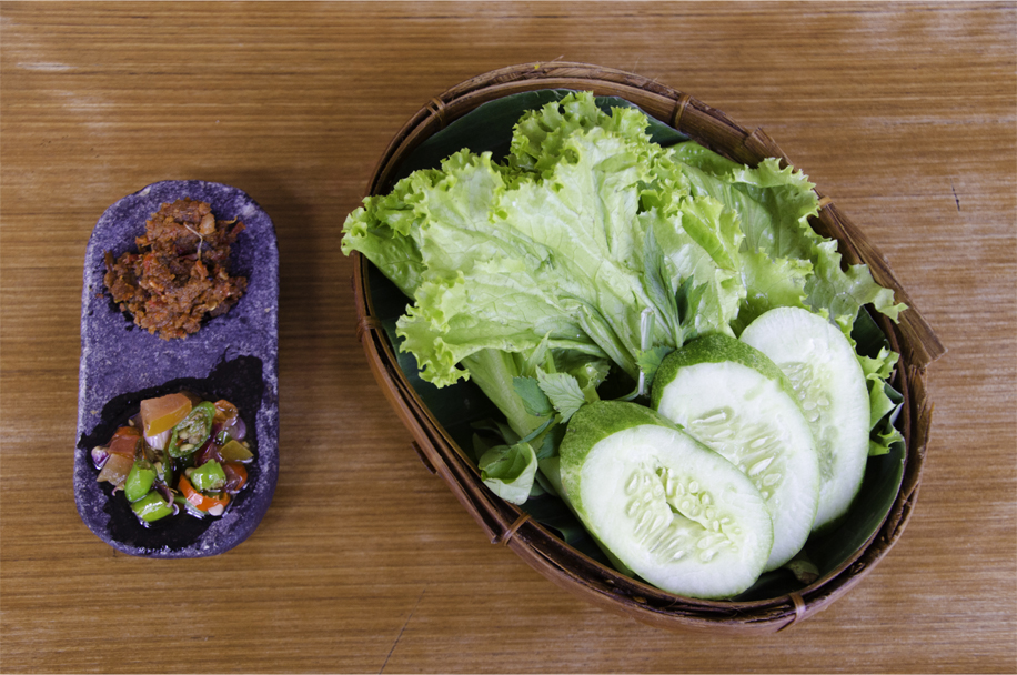 Lalapan (raw Sundanese salad) with sambal oncom (made from fermented soybean cake) and sambal matah, Bandung