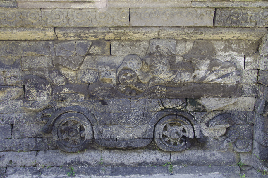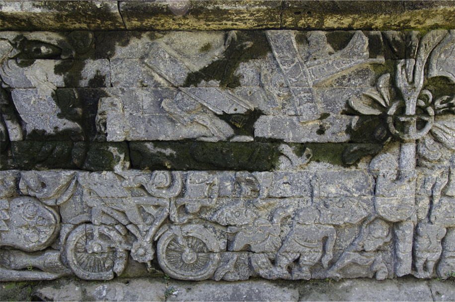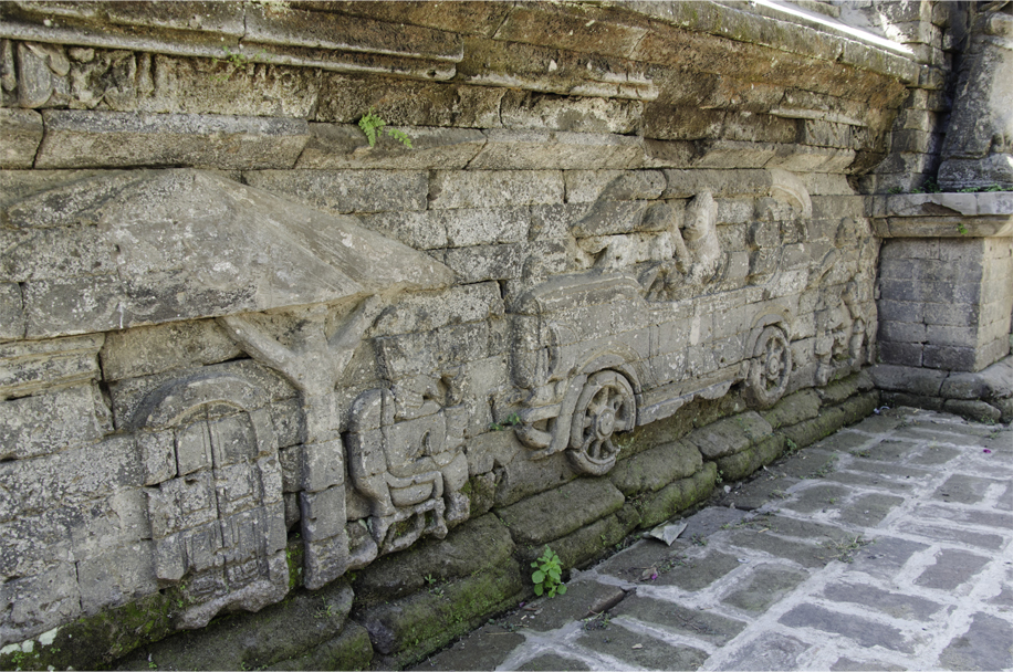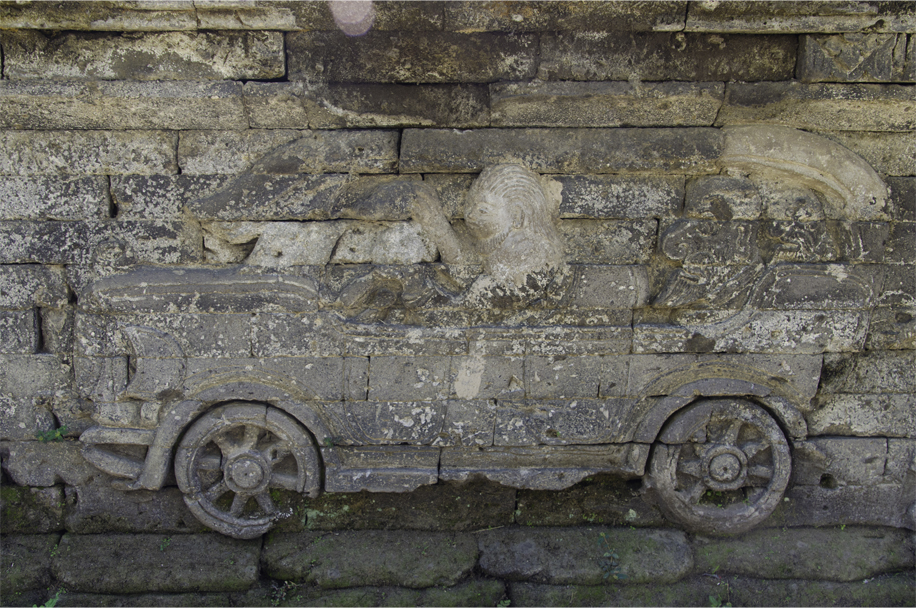 The local craftsmen carved a warship, two biplane fighters swooping down on terrified villagers, a bicycle and two cars, including a Ford Model T flying the Dutch flag, its driver brandishing a pistol. These carvings were interspersed with bucolic scenes, with a man climbing a coconut palm, another man fishing, and children flying traditional kites. Taken together, these glimpses of daily life allude to a tranquil existence before the war.