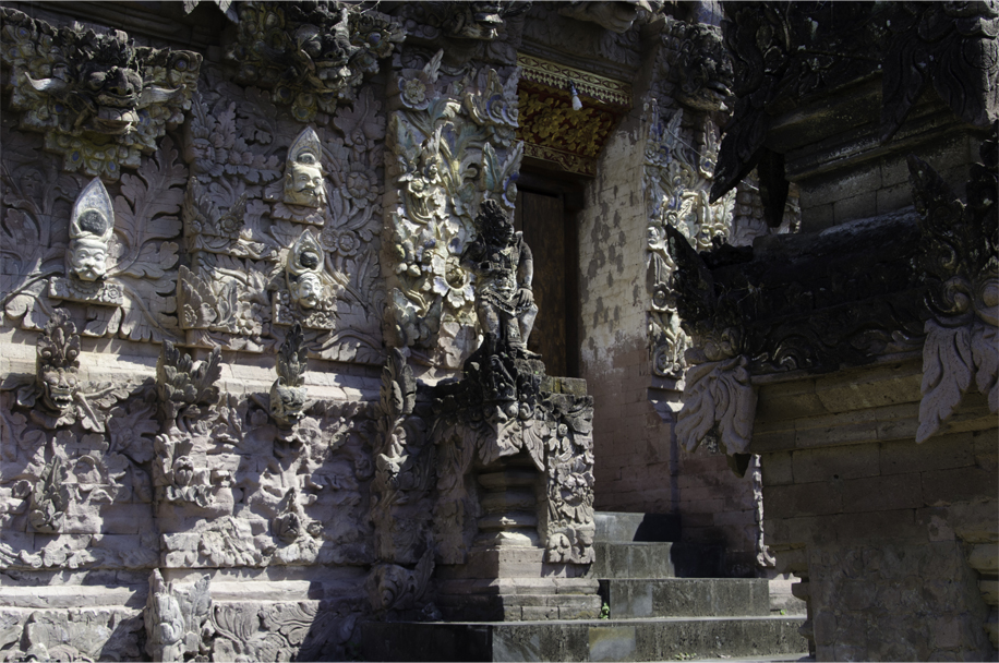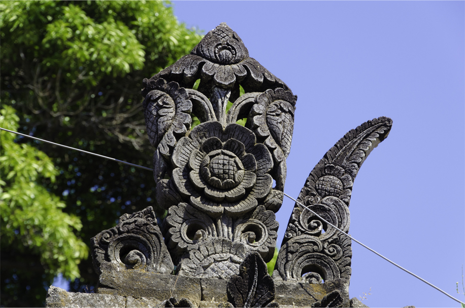 The gentleman also explained the design of the kori agung front gate. To the Balinese Hindu, he said, it symbolises both the macro-universe and micro-universe. At the macro level the kori agung is a mountain, while it represents a face at the micro level. The two side doors are its ears, the middle its mouth, the carvings above the main door its nose and the small sculptures on either side its eyes.