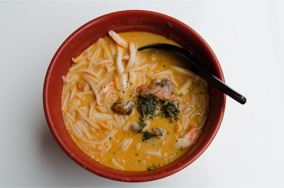 We order two sides of otah – fishcake grilled in banana leaves – and indulge in large bowls of the house specialty. The soup base alone is a revelation; I am gobsmacked by the addictive blend of coconut milk, shrimp paste and a complex mixture of spices. The prawns within are firm and fleshy, while clams lend the dish an extra savoury kick. As for the rice noodles, they are cooked to just the right texture: lusciously soft but retaining a subtle firmness.