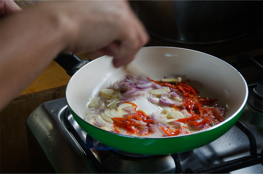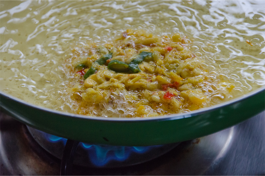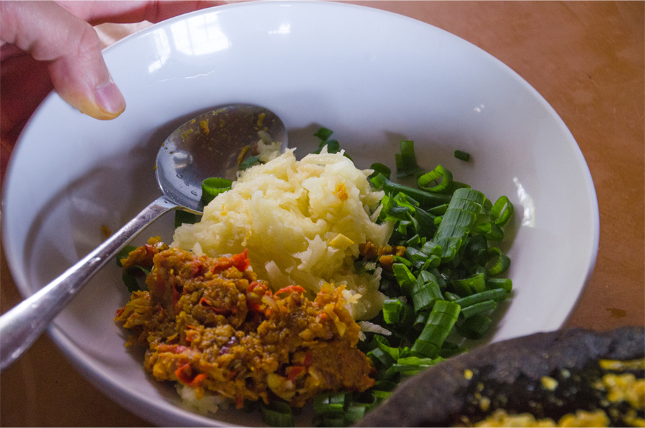 Made assigns me to the skillet, and soon I am wholly engrossed in the pursuit of creating a perfect perkedel. There is a certain satisfaction to be had in frying these until golden brown on one side, before turning them over with a quick twist of the tongs and cooking them evenly. Once the fritters are set aside on paper towels, I take on the role of photographer, darting around the kitchen as Bama assumes control of the skillet.