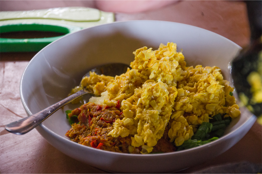 Our first task is to prepare corn fritters known as perkedel jagung. It proves a labour-intensive process, and we are kept busy chopping spring onions, grating potato, mashing kernels of corn, and grinding an array of spices in a mortar and pestle until it forms a paste. We add raw egg, soy sauce and rice flour to the mixture, then Made shows us how to deftly slide it into a skillet of bubbling coconut oil.