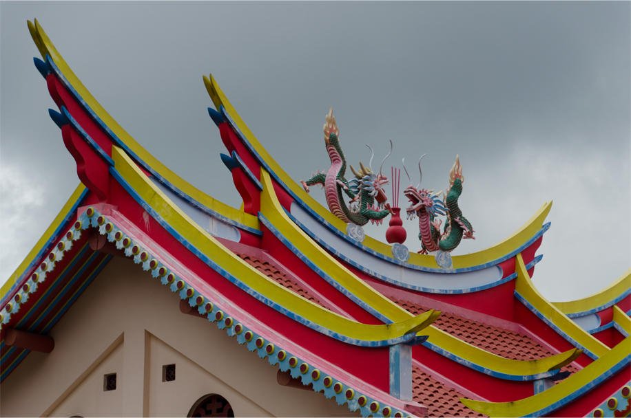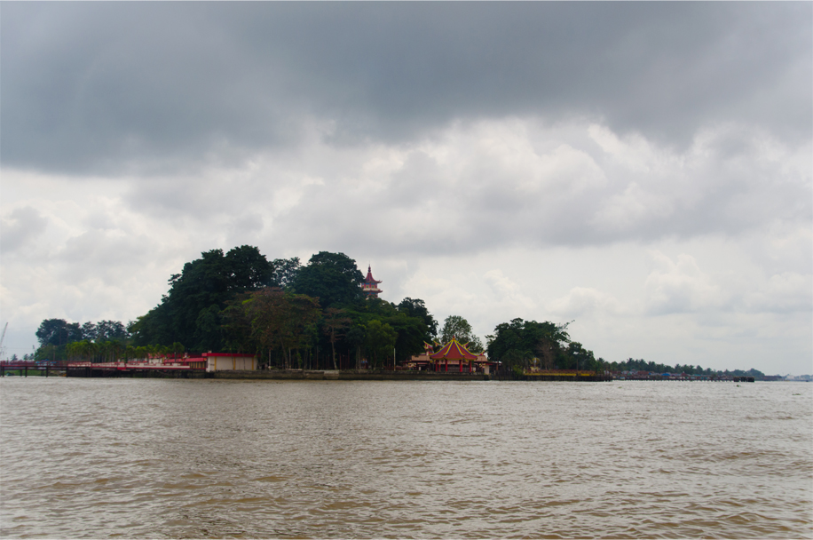 We barrel past floating shacks, stilted houses and people bathing in the tan-coloured waters. The pilot takes us between ocean-going container ships anchored off the port, and soon the acrid stench of ammonia stings our nostrils as we pass the belching chimneys of a fertiliser factory. Scanning the horizon, I wonder where Pulau Kemaro could be amid all the industrial grime. But soon enough a lonely pagoda emerges out of a clump of greenery, as does a Chinese temple by the water’s edge, its sweeping roofs suggestive of a ship’s keel. It strikes me as an improbable, mirage-like scene.