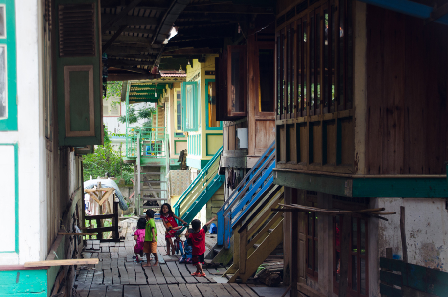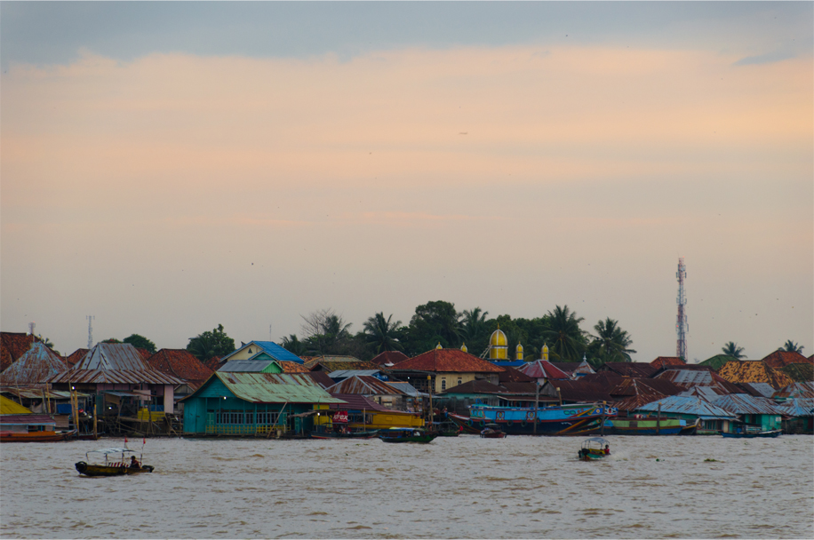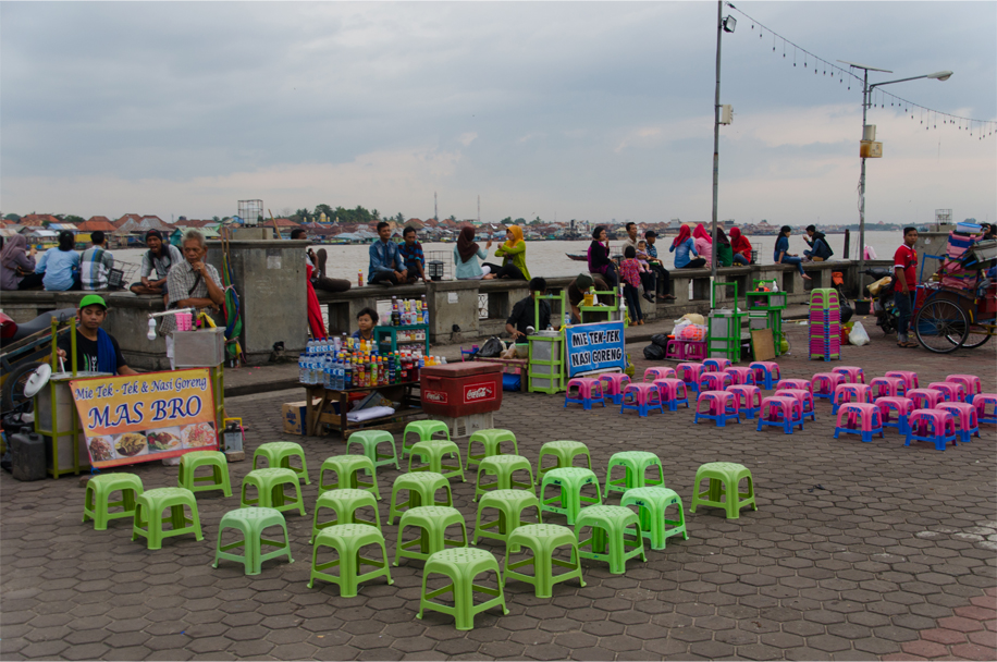 A procession of street vendors, all selling mie tek-tek and nasi goreng, call out to prospective customers; hungry diners sit waiting on tiny plastic stools in green and bubblegum pink. A grinning busker takes his place in the crowd, performing several popular love songs. Nearby a group of young residents sit in a tight circle. One has a guitar slung over his shoulder, and while the busker croons he plays a stream of notes in unison. In the same way I’m encouraged to fall in step with the rhythms of this easygoing river town.