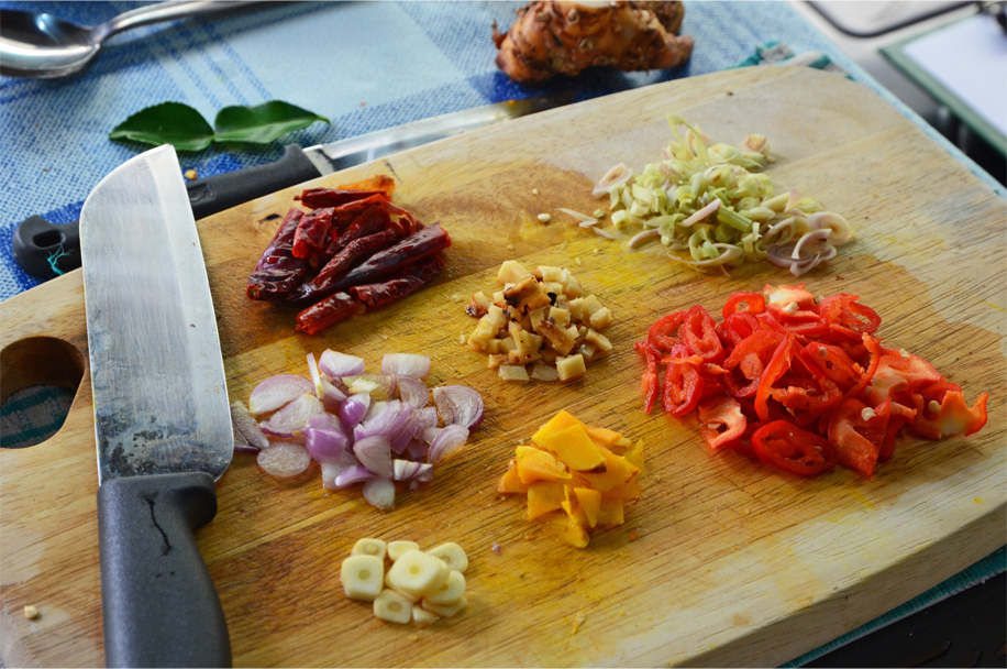 I struggle to multitask between the roles of cooking student and photographer as Pearly’s tips come in thick and fast. Once in the pot, the spice paste needs enough cooking oil to give it a shine. The meat must be placed bone side down to conduct heat, and we watch as Pearly scrapes the sides of the pot for every remnant of spice paste. “Every little bit is flavour,” she says, “don’t be afraid to use them. They only become bitter when they are dry.” Pearly also tells us to pay attention to the time, for the pot must be refilled with water every 45 minutes or so.