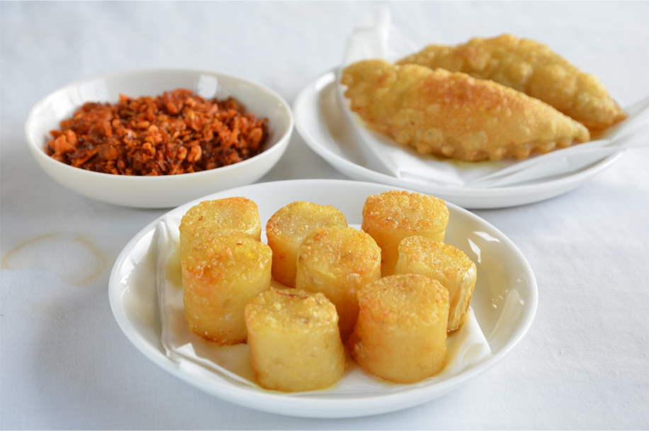 Fried snacks made from sticky rice, samosas and chilli flakes with dried fish