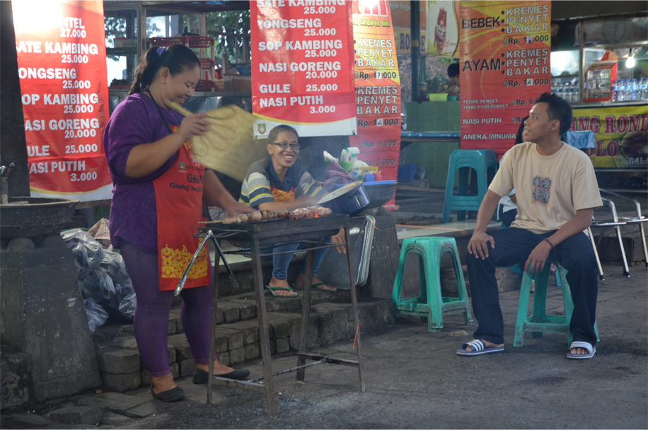After dinner, we wait an hour in line for bungkus (takeout) at Gudeg Pawon, a warung converted from a typical Javanese house. Jogja’s signature dish of gudeg – stewed young jackfruit – will be tomorrow’s pre-dawn breakfast. The heat of the kitchen fills the air, and I can feel the beads of sweat forming on my face and arms. The line moves at a snail’s pace, past a vat of jackfruit stew simmering away on a simple firewood stove. When it is finally our turn to be served, the attendants heap gudeg, chicken and boiled egg on a portion of rice, deftly wrapping the whole ensemble in banana leaf and brown paper.