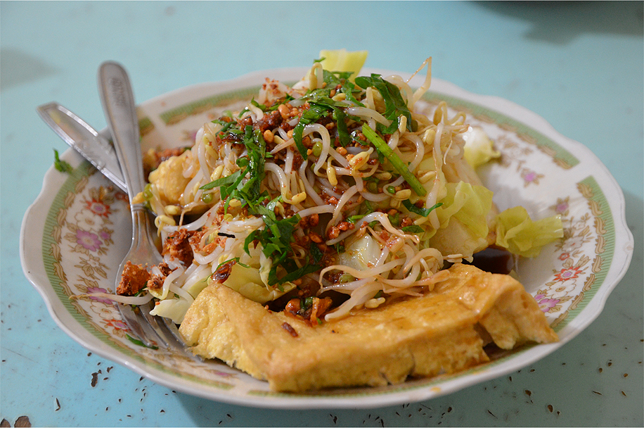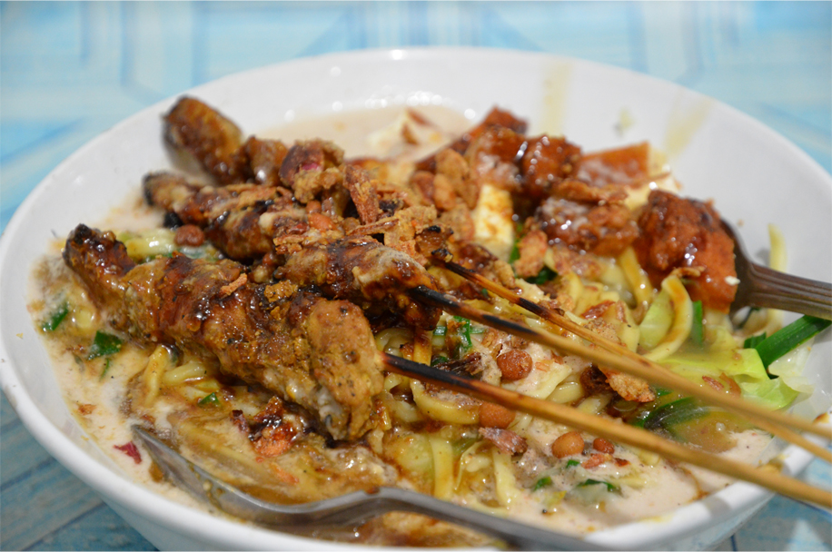 Apart from the popularity of soy sauce, I spot a few other Chinese influences. In the highlands of Dieng – accompanied by fellow travel bloggers Bart and Badai – Bama and I sample mie ongklok, a specialty of nearby Wonosobo. It consists of noodles, cabbage and chopped chives in a thick, starchy sauce, served with beef sate. The noodles are boiled with the help of a woven bamboo basket called ongklok, hence the name. For dinner near the ancient Buddhist temple of Borobudur, we try kupat tahu – a bowl of rice dumplings, fried tofu and bean sprouts in peanut sauce.