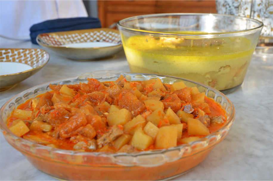 Auntie Dhani’s “sambal kentang goreng” (foreground) and opor ayam