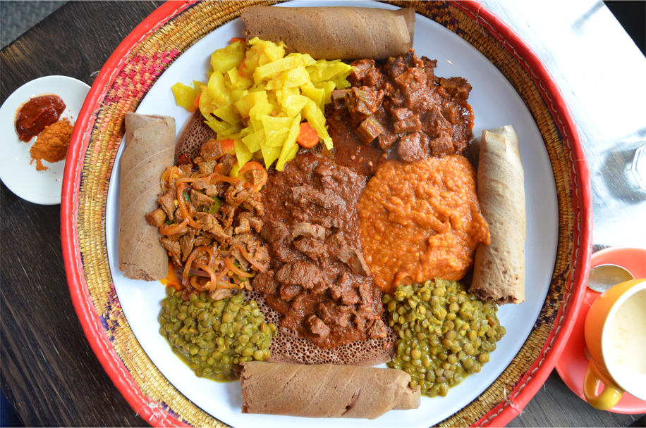 Ethiopian cuisine is not something one would readily associate with Australia. But in Melbourne, Victoria’s state capital, Bama and I get our first taste at Saba’s on Brunswick Street, the main artery running through the bohemian inner-city suburb of Fitzroy. The young proprietor, Saba herself, serves us her mother’s recipes with a gleaming smile. Bama and I share a platter of injera, a spongy flatbread made from fermented teff flour, tearing off large pieces with our hands to mop up a tantalizing assortment of meat and vegetable stews.
