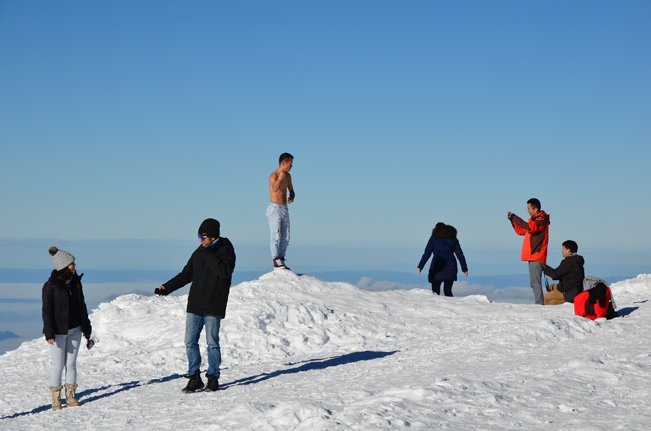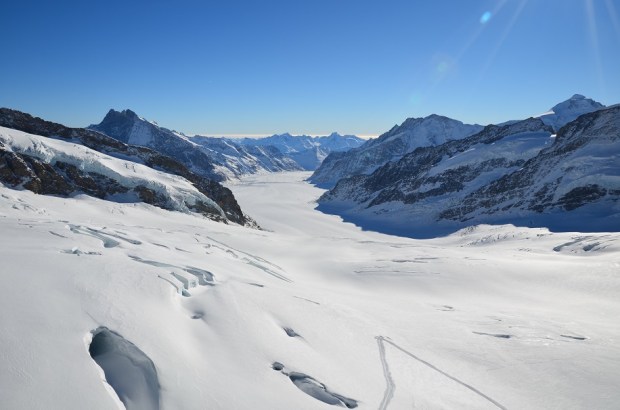 Sandra and I troop past glowing larger-than-life edelweiss flowers and a giant snow globe into the Ice Palace, the creation of mountain guides who carved out passageways from the Jungfraufirn glacier in the 1930s. Maintained at a temperature of -3° Celsius (26 Fahrenheit), the niches here are adorned with ice carvings of local wildlife. Our next stop is the Plateau, an area that is the starting point for glacier and mountain treks. Sandra is visibly shocked when she sees a large number of tourists straying beyond the safety perimeter marked with orange and yellow ropes. They seem blissfully unaware of the risk of falling into hidden crevasses. As at any major tourism site, we witness the narcissism of 21st-century travel that has become increasingly apparent with the rise of social media and the selfie. Among a boisterous Thai-speaking group, a man pulls off his shirt to strike a pose atop a mound of snow. “The Americans are worse,” Sandra quips. “Sometimes they come here and strip naked.”