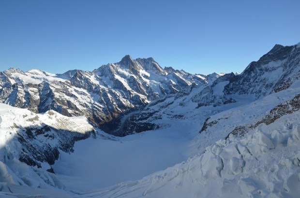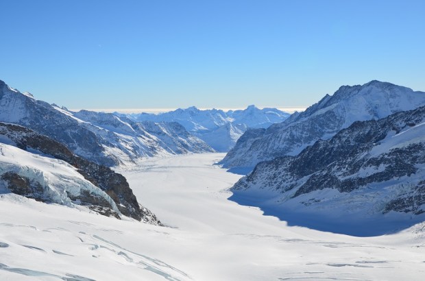 As Sandra demonstrates, getting to Jungfraujoch is far easier than it sounds. We hop aboard a train from Interlaken Ost station to the steep-sided Lauterbrunnen valley, whose dream-like scenery and 72 waterfalls inspired Rivendell in Lord of the Rings, and change at Lauterbrunnen for the Wengernalp Railway to Kleine Scheidegg. We’re joined by a contingent of Swiss students and a motley of visitors from farther afield. Just 48 minutes after boarding the train at Kleine Scheidegg, Sandra and I disembark into a cavern at Jungfraujoch.
