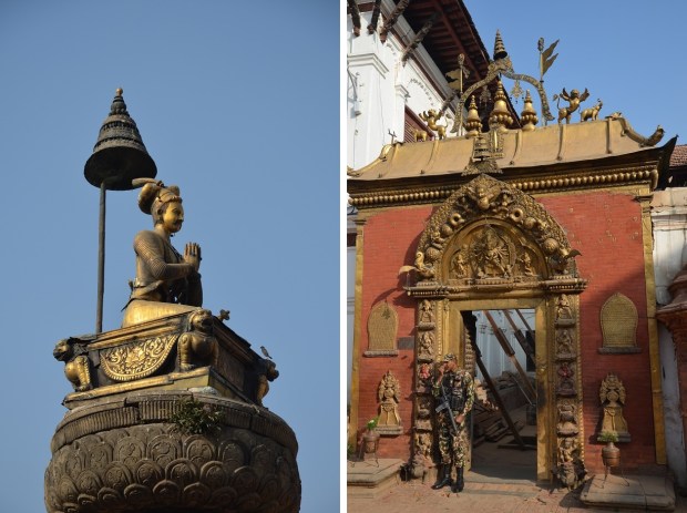 King Bhupatindra Malla’s statue and the Golden Gate, both at Durbar Square