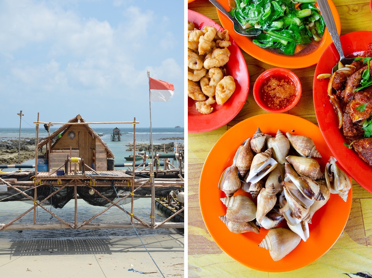 A “kelong” fishing platform; sampling the local specialty “gong-gong” (dog conch)
