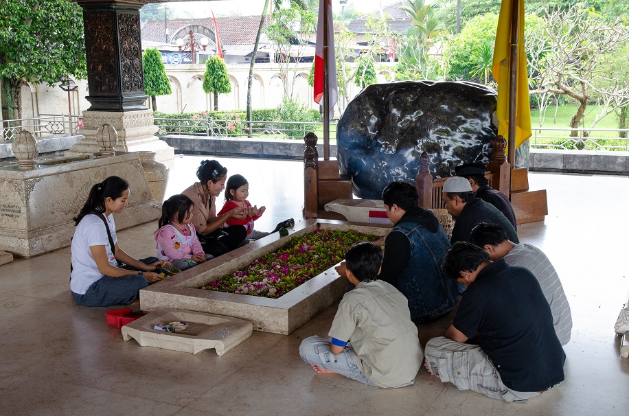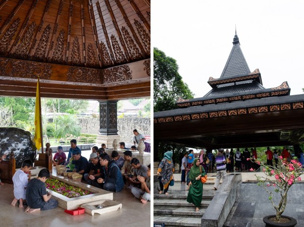 The mood at Sukarno’s mausoleum is one of admiration and respect: it’s thronged with pilgrims but everyone speaks in hushed tones. His tomb lies next to the graves of his parents below a pyramidal, three-tiered roof soaring above a raised platform, where we remove our shoes before climbing the steps. A cheerful caretaker welcomes me with a firm handshake and asks if I’ve been here before. Referring to Sukarno with beliau, the honorific for “him” or “her”, he adds, “His mother was Hindu, from Bali. His father was from Java.” Most visitors sit cross-legged or kneel on the polished marble. Some have their eyes closed and hands opened in prayer; the sweet aroma of cempaka incense hangs in the air as pilgrims toss white and purple rose petals, fragrant jasmine, and kenanga flowers onto the tomb.