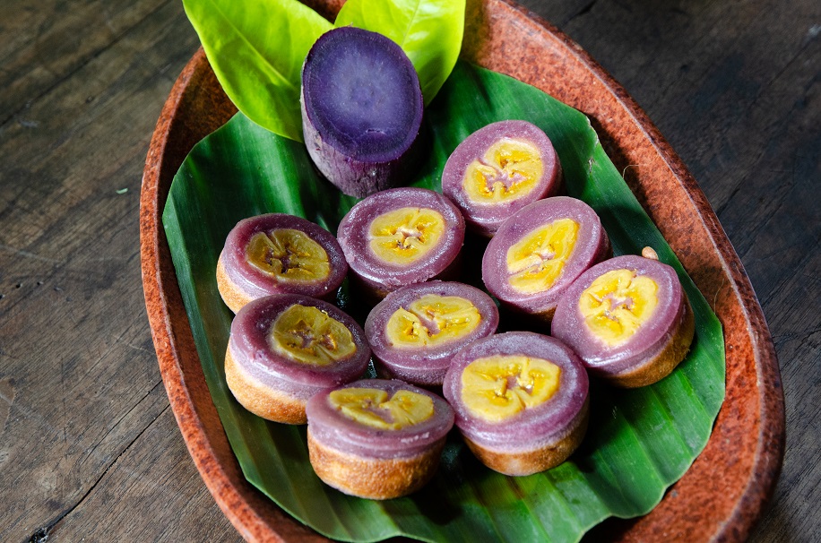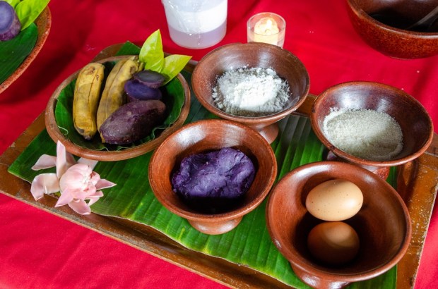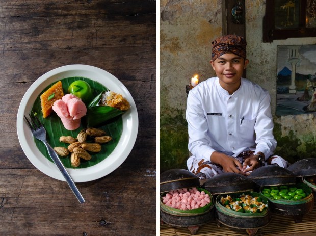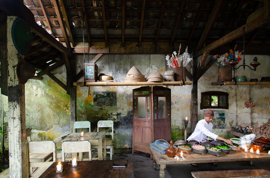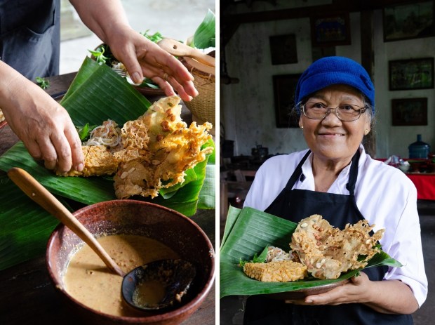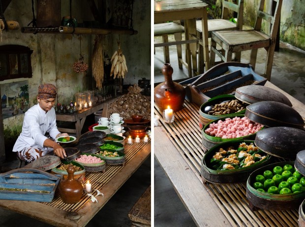 Later that day, after photographing two of the area’s three ancient Hindu temples, Bama and I return to Tugu Blitar for its Javanese fare. Sukarno might have been intensely modern but he did have an appreciation for traditional arts, food, and culture. Had he been alive today, I imagine that he would have enjoyed afternoon tea at Waroeng Jawa, a shaded, rustic space recalling the informal street-side eateries beloved all over Indonesia. Against a backdrop of delightfully weathered walls, antiques, and a bamboo rack hung with dried corn, shallots, and rice stalks, we are served boiled peanuts with an assortment of sweet treats: a pandan-flavored green jelly called talam jagung, fluffy steamed kue mangkok in an eye-catching shade of pink, sticky diamond-shaped kue wajik, and deep-fried banana (pisang goreng) topped with shredded coconut and palm sugar.