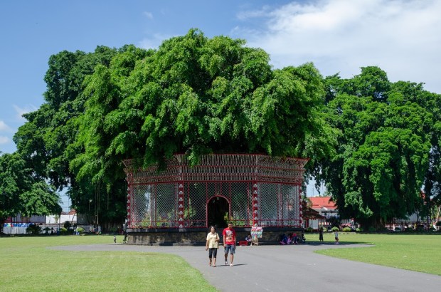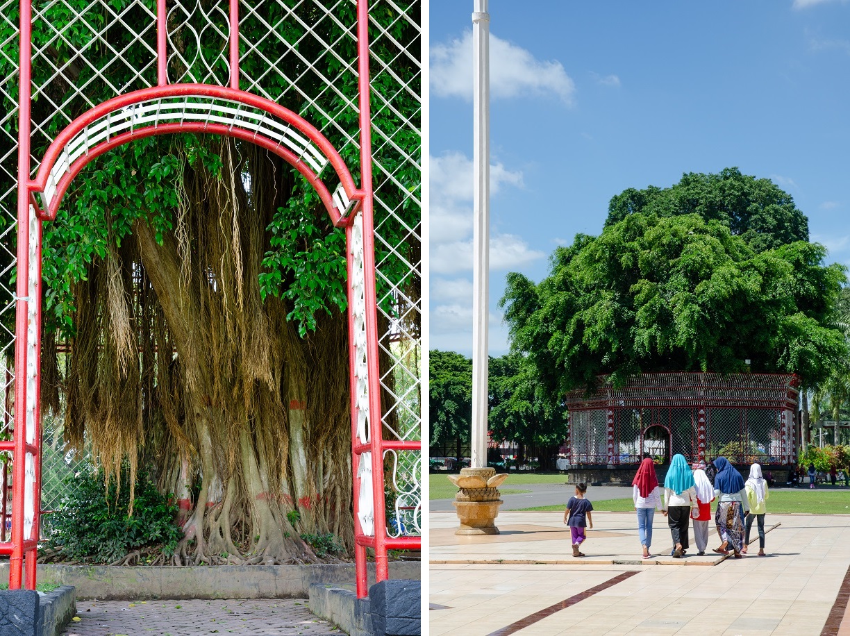 Blitar isn’t the easiest place to reach, particularly for travelers coming in from abroad. Getting there requires at least a four-hour drive from Surabaya, home to the nearest international airport, but Bama and I find a quicker route by hopping aboard a domestic flight from Jakarta to Malang, just two and a half hours up the road. The drive takes us through a landscape dominated by volcanoes shrouded in low clouds: it unfolds as a tableau of warehouses and factories, villages, paddy fields, and a reservoir backed by lush mountain forest. Blitar is astonishingly quiet, with well-tended streets lined by wooden fences and concrete walls painted in the distinctive red and white colors of the Indonesian flag. Turning left at the central square, where an enormous banyan tree rises out of an open-roofed garden pavilion, we eventually spot our home for the next three nights.
