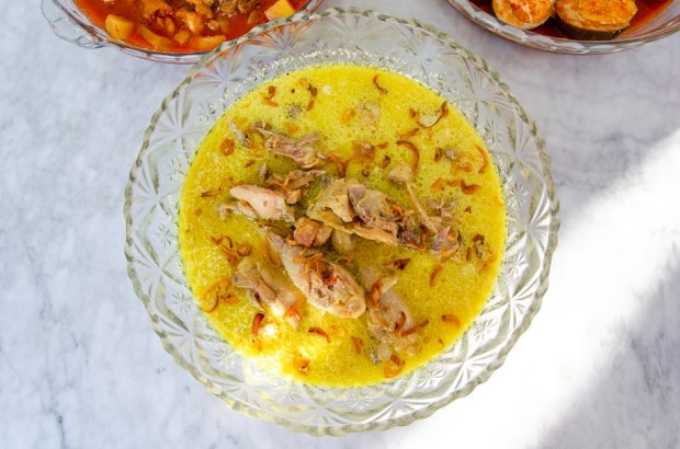 Naturally, it was during Idul Fitri five years ago that I first tasted Auntie Dhani’s opor at her home in Semarang, the sleepy provincial capital of Central Java. Lifting a spoon to my lips, I closed my eyes and took a deep whiff of the pastel-yellow sauce. An intoxicating fragrance immediately washed over my olfactory receptors. What was this wondrous perfume? I don’t know how else to describe my memory of that particular aroma, except to illustrate it in this bucolic tableau: a grove of fruit-laden coconut palms, coriander and cumin drying on mats in the equatorial sun, free-range chickens roaming the fields below a Javanese volcano, clumps of lemongrass beside a bubbling brook. It was a revelation. On the tongue, the opor felt smooth and perfectly balanced in more ways than one. Auntie Dhani’s expert blend of spices, herbs, and seasonings did not overwhelm the palate; the soupy sauce was neither too thick nor runny like water.