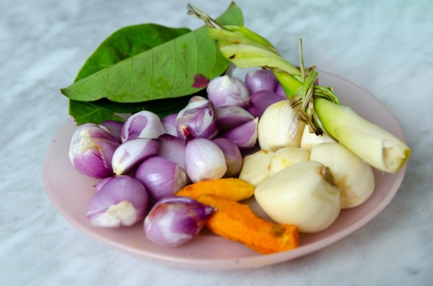 Some of the ingredients used in Auntie Dhani’s opor: shallots, garlic, salam leaves, lemongrass, and turmeric