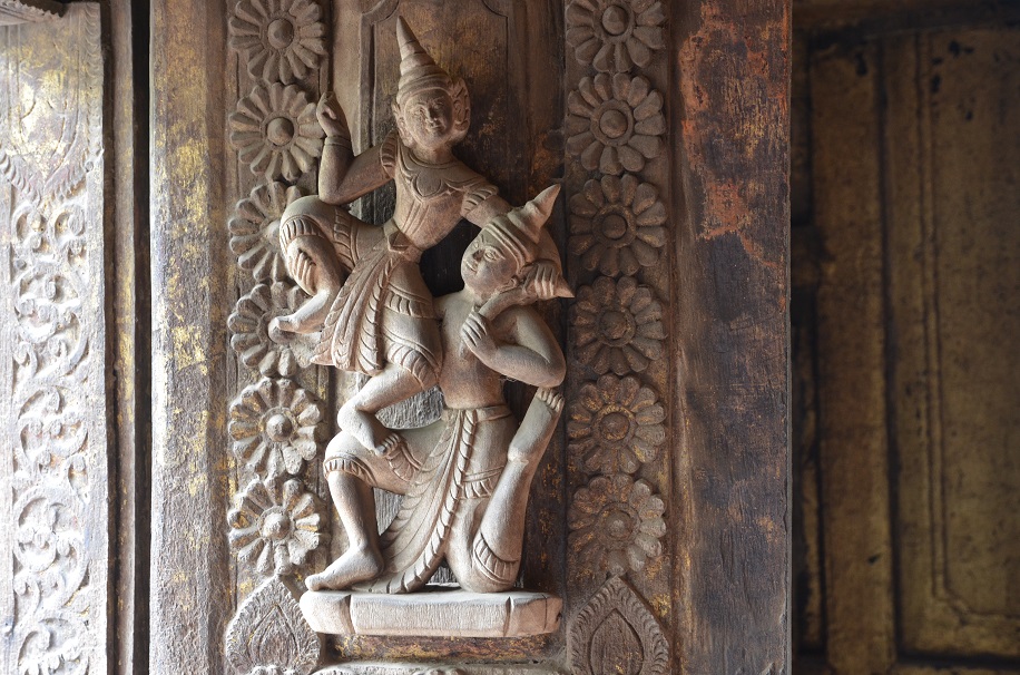 Teak carvings at Shwenandaw Monastery, Mandalay; novice monks studying outside Nyaung Shwe