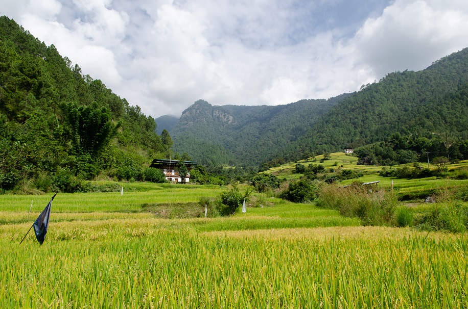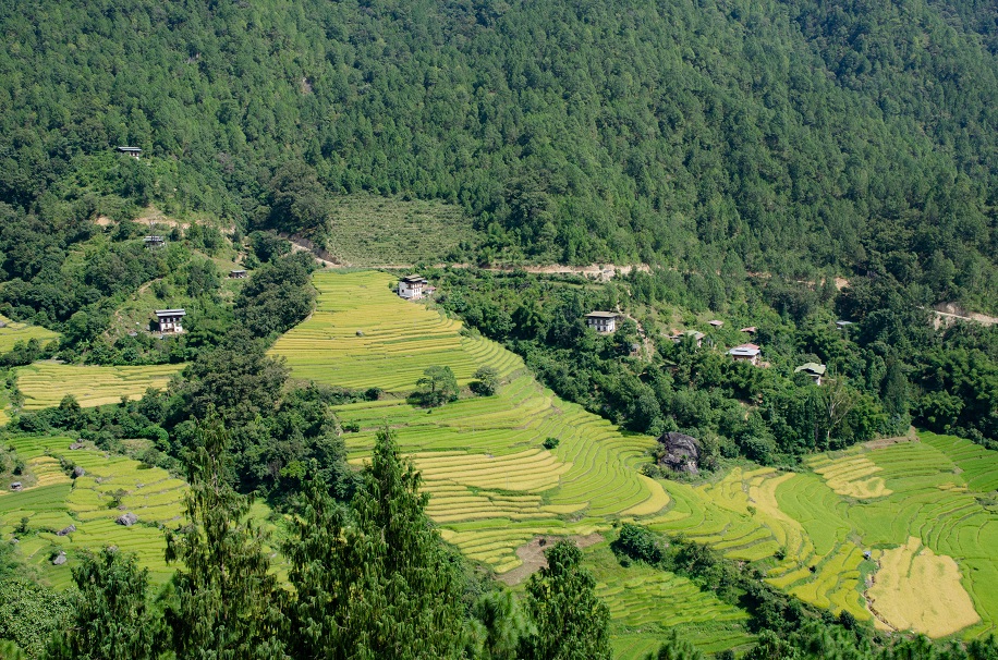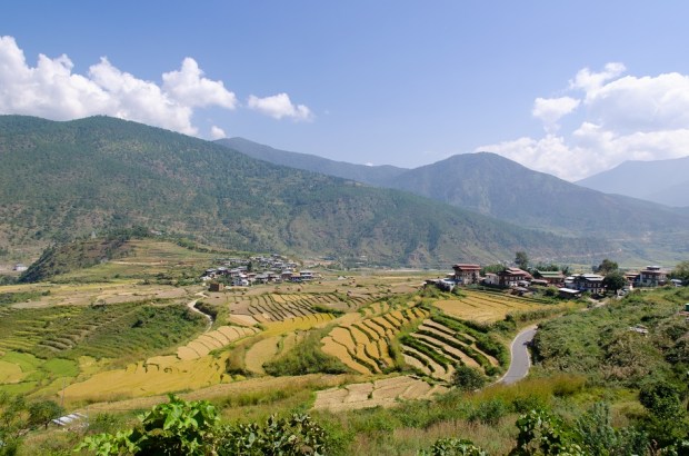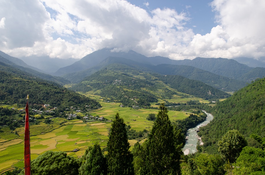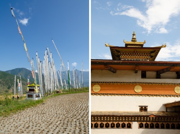 Spread out below steep hillsides cloaked in chir pine – and flanking a calm, powder-blue river named the Puna Tsang Chhu – lies a gleaming patchwork of rice paddies more beautiful than any I’ve seen outside Indonesia. Village houses built of stone or rammed earth, all with timber-framed trefoil windows, dot the landscape; tall prayer flags adorn the fields and hillsides, fluttering in the breeze. This is Bhutan’s “rice bowl”, a land of plenty where both the red and white varieties of the grain flourish, where farmers can grow all kinds of fruits and vegetables less suited to the colder conditions of Thimphu. The sweaters we wore earlier that morning at cloud-wreathed Dochula Pass, perched 3,100 meters (10,171 feet) above sea level, feel wholly unnecessary.