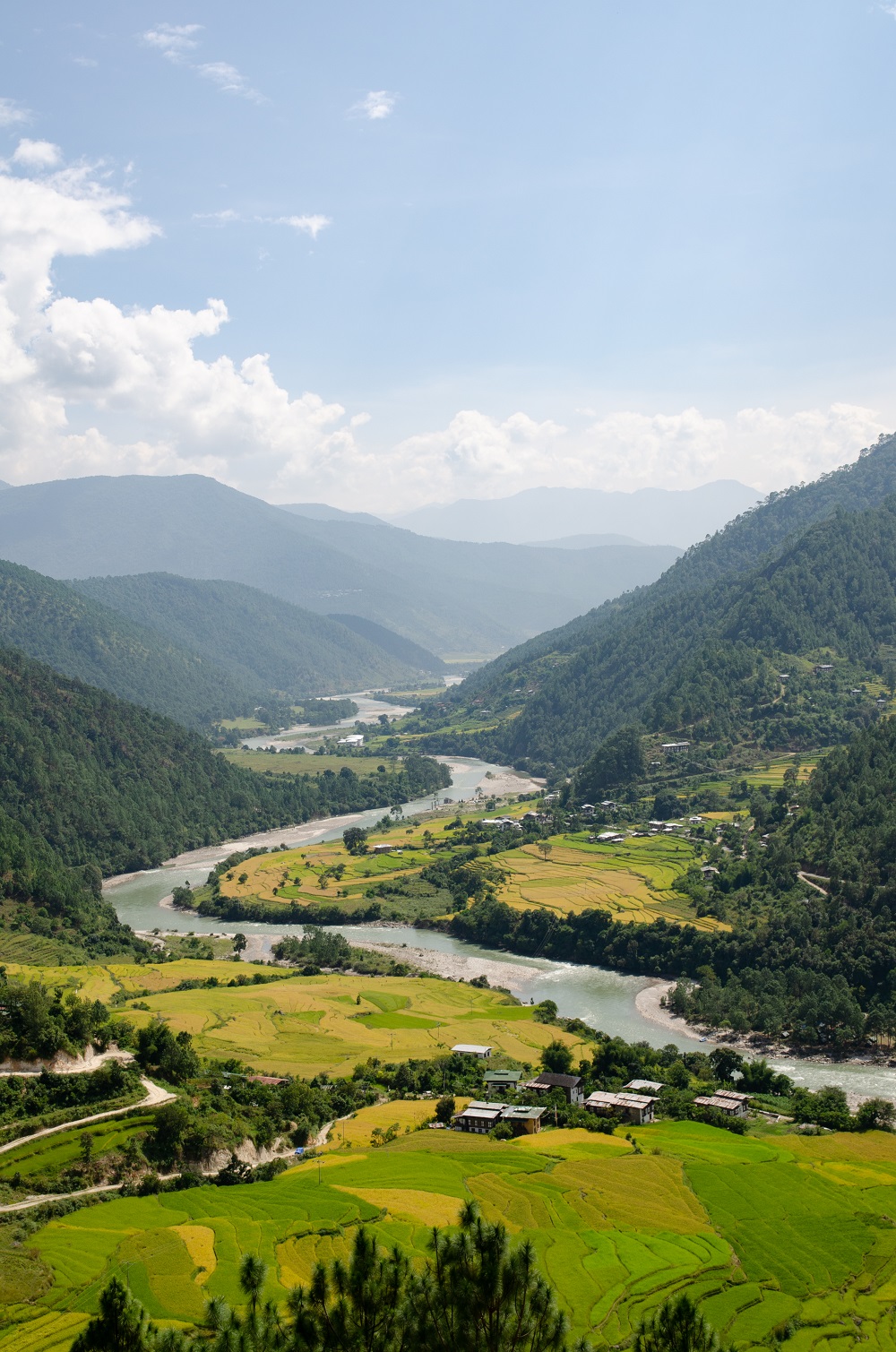 Clouds fill the sky over Punakha the next morning as we cruise past the junction with the road leading down from Dochula Pass. We’ve come at just the right time. The fields at Sobsokha appear barren after the harvest, but those up the valley tease our eyes with thousands upon thousands of rice plants, blanketing the landscape in glorious shades of yellow and green: from lemon and lime to moss and chartreuse. Bama and I are so captivated by the scenery that we ask Phuntsho and Kinga several times if we can pull over to take pictures, a request they graciously accept. Then, after descending to a small parking lot on the riverbank, it’s time to cross the glacier-fed Mo Chhu (Mother River) on foot.