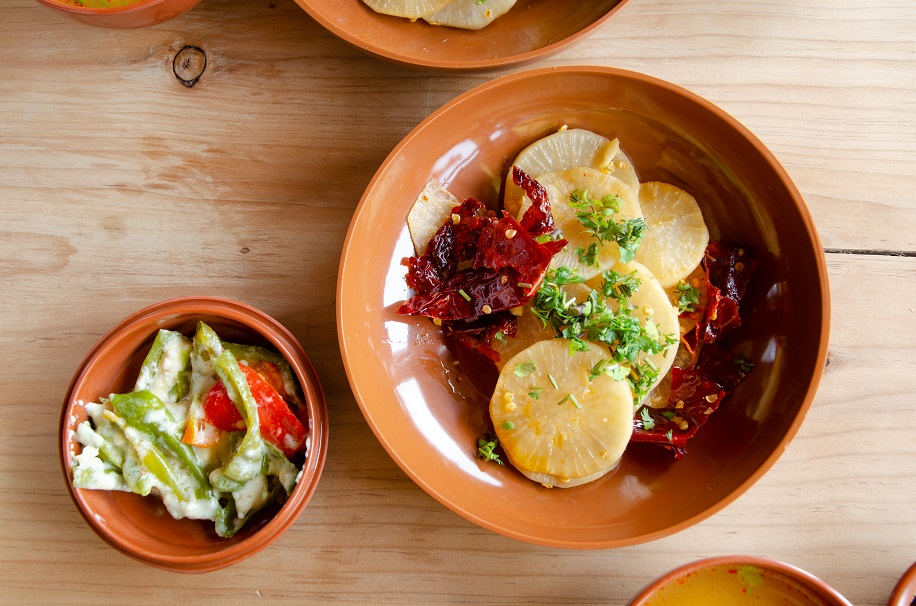 If my memory serves me correctly, it consisted of halved baby potatoes, thin slices of red onion, chopped dried red chilies, a bit of garlic, cracked black peppercorns, toasted mustard seed, and there may or may not have been finely chopped cilantro leaves (I’m not 100% sure on this one). I don’t recall there being any sour notes but a squeeze of lemon or lime could be a nice touch.