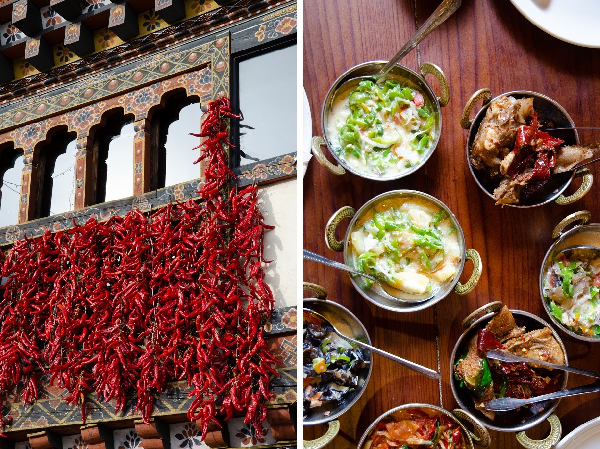 Chilies being air-dried in Paro; kewa datshi and other dishes at a Thimphu hole-in-the-wall