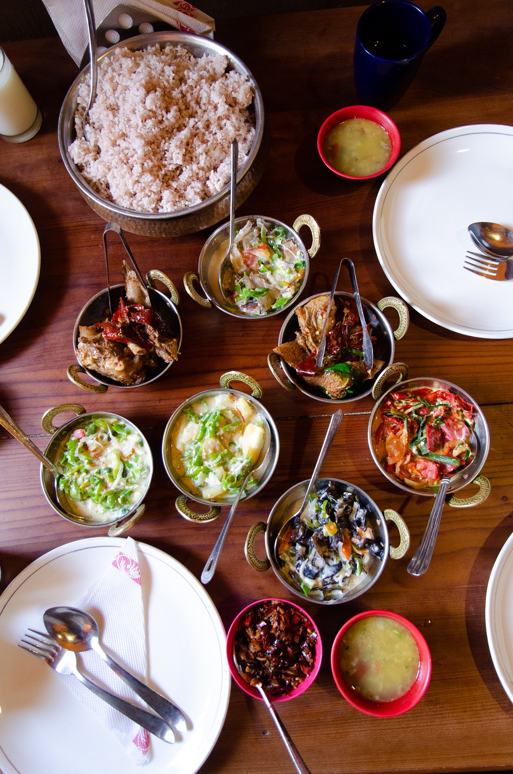 Incessant rain and mist greeted us on the morning of our final full day in Bhutan. After descending the muddy trail from Tiger’s Nest, dripping wet and soaked to the bone, we were driven the short distance to Three Brothers, a homey stone-clad restaurant just down the road. Inside, the sympathetic waitstaff greeted us warmly and had our food on the table in no time. Bama and I were just about to unzip our camera bags when we both realized we could skip the requisite picture-taking. Ravenously hungry after the hike and eternally grateful for this hot meal, we dug right into the assortment of cheesy dishes – ema datshi included – without a second thought.