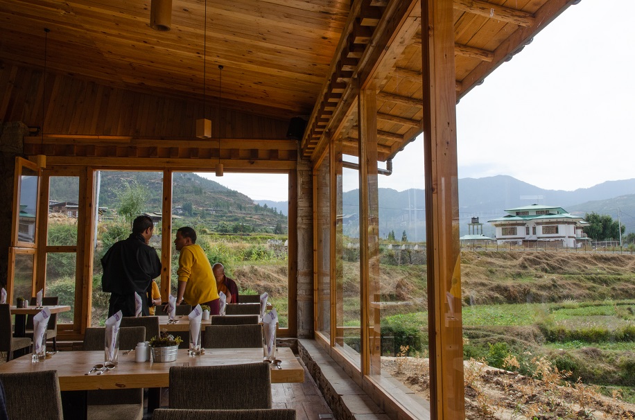 Bama and I eschewed the Indian and Western food on the menu for a Bhutanese set lunch of thickly sliced radish with sweet dried chili, a generous helping of rice, soup, cucumber salad, and ema datshi. Our meat-free meal was genuinely a delight, and so too was the look of Your Café’s rustic-contemporary dining room. The designers had retained the original rammed earth walls but added stonework and several modern details: spherical lamps and Edison bulbs hung from the pine-wood ceiling, while daylight flooded in through plate-glass windows framing views of the neighboring rice fields. Never mind the funny name – Your Café was so inviting we could imagine whiling away a rainy afternoon here with mugs of suja, some snacks, and a good book.