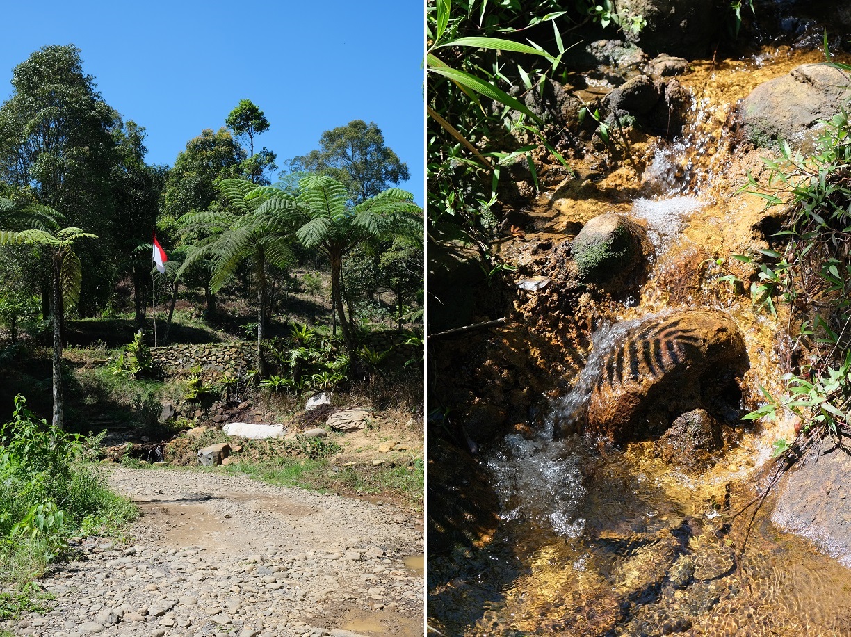Every now and again we come across a small bamboo shack with outdoor seating. Each one peddles a variety of drinks and snacks; instant coffee sachets are strewn up like garlands framing the counter. Local villagers relax in the shade and converse in the melodious tones of Sundanese, West Java’s predominant language and one that Bama speaks fluently thanks to his upbringing in the province. Then, on a flatter section lined with tree ferns, the sound of pure mountain water pouring into a small pool beside the trail grabs our attention. “Look how clear it is – you can see straight to the bottom. This would be impossible in Jakarta!” Bama exclaims. West Java is known for its abundance of fresh water, and sure enough, a series of streams cut across the path: we traverse the widest and deepest via some wobbly stepping stones. Prior research had also clued us in on the existence of Curug Ipis (Sundanese for “Thin Waterfall”), a little cascade three quarters of the way to Cisadon.