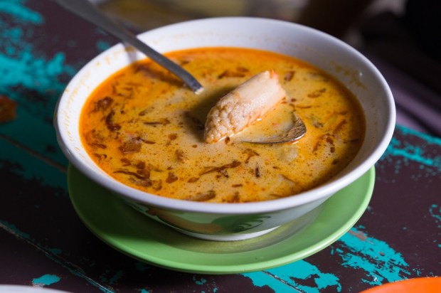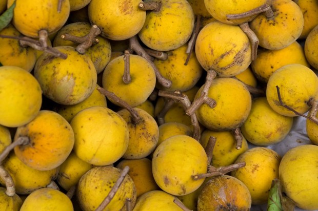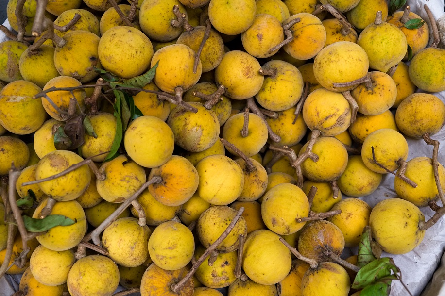From a narrow road bisecting the high street, we turned down an alleyway and saw a riot of tropical fruits heaped in baskets or displayed on countertops: mangoes about the size of an American football, lipstick-red rambutan, deep purple mangosteens, and something else that instantly caught Bama’s eye. These were round golden kecapi, rare treats he remembered from his childhood. Cutting away the thick rind reveals five segments of white, cottony flesh that doesn’t separate easily from the seeds, so the best way to enjoy kecapi’s delicate sweet-sour taste is to suck on each piece like a candy. Bama couldn’t resist buying one and a half kilos of the stuff to bring home.