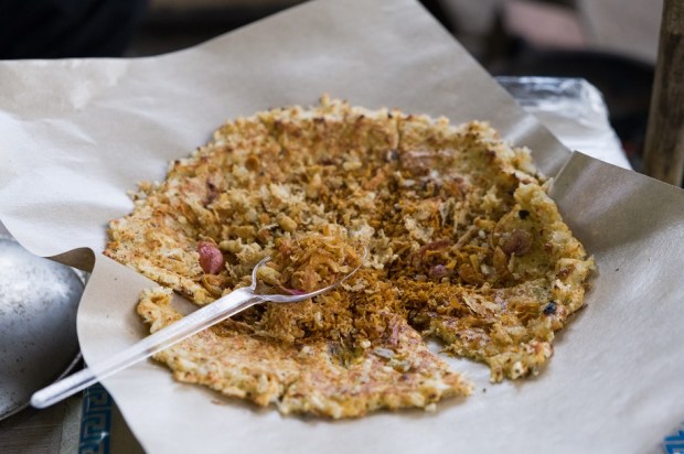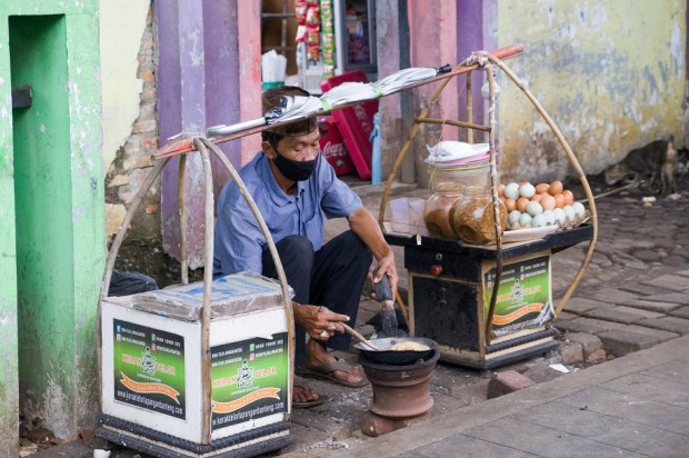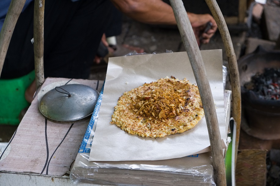 Kerak telor vendors have a unique method for making sure both sides are done properly: turning the cooking pot upside down. Since it isn’t lubricated with oil, the starchy coconut omelet holds fast to the hot steel. Faisol fanned the flames and allowed them to lick the upper side, leaving tiny char marks as it gradually turned golden brown. Eventually the kerak telor was flipped back over for a final bit of cooking and separated from the wok with a metal spatula. Faisol piled on generous toppings of darker, more heavily spiced serundeng and fried shallot, before allowing the finished product to rest on a sheet of food-grade paper. “This [kerak telor] is the best,” Faisol said cheerfully. Though I couldn’t see it, I could tell he was grinning beneath his mask.